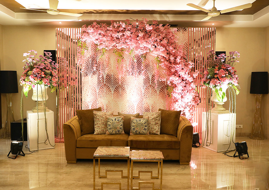 Pops of pink, red and lush floral setups made this couple’s home-based Roka ceremony a lively one!