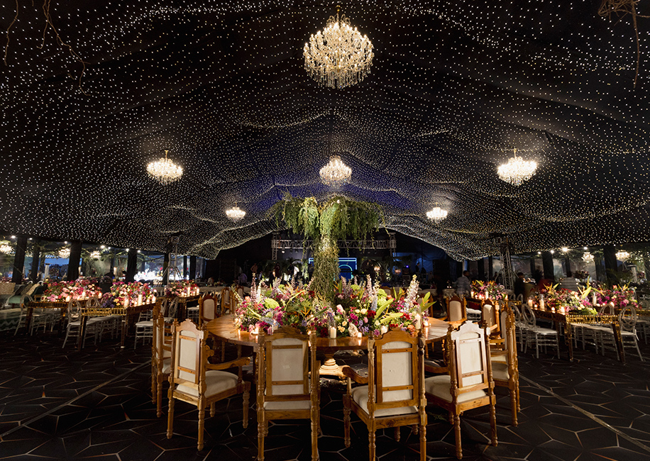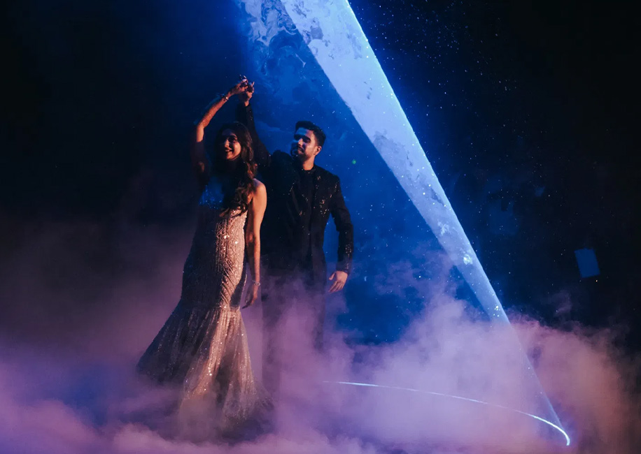 Fusing nature and tech with neon light and holographic projections, this sangeet was an epic one!