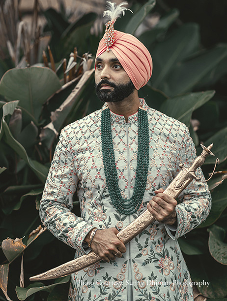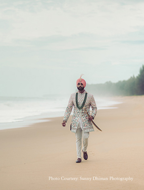 Sanjay wore an ivory and mint sherwani with gold embroidery on the borders of the stole by His Studio, Chennai for his Anand Karaj ceremony.
