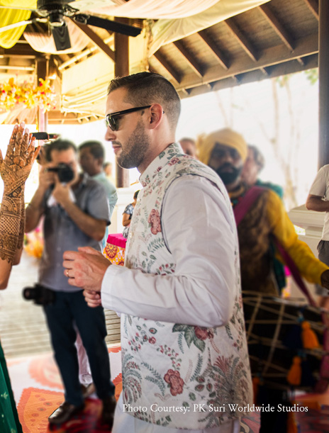 Manish wore a floral motif Jodhpuri suit by Rohit Bal for the Caspian Sea Sundowner mehndi function in Azerbaijan.