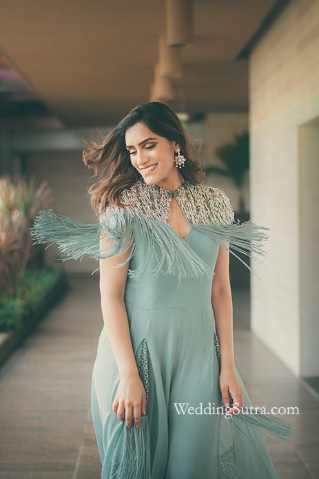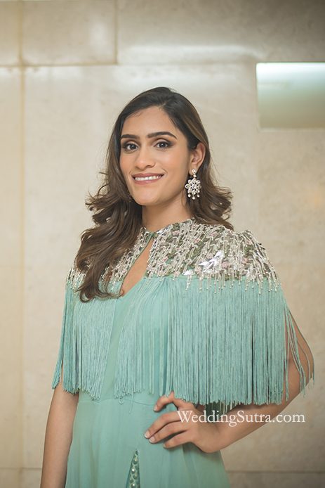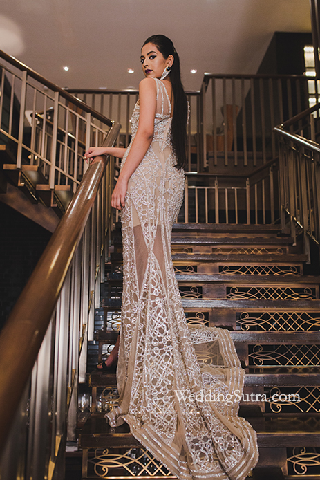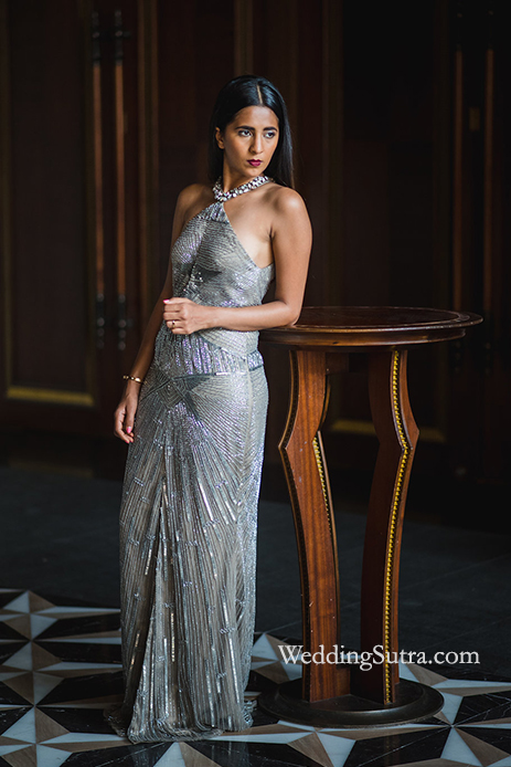 Subdued colours spell sophistication. Pair them with sparkles and you are bound to get something that looks utterly glamorous. Shagun’s beige body-fit gown by Karleo Fashion with lattice-like embroidery all over was an outfit that looked like it was borrowed from international runways. The statement neckline paired with sleek hair and minimalistic jewellery had her looking like a true diva.
