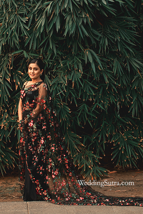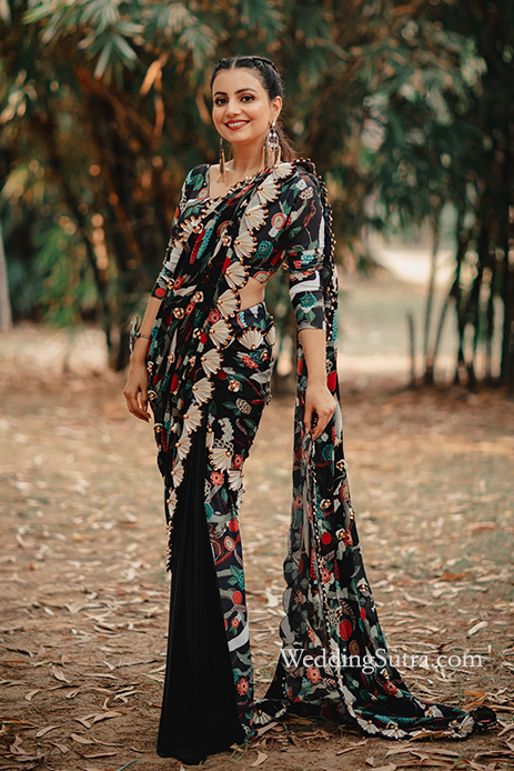 Jessica’s look takes a walk down the path that runs between bold, modern and chic all at the same time. The black net saree by Shivan & Narresh features embroidered flowers in contrasting colors of red and white and the drape is paired with a strappy sequins blouse. Complete with bold lips and a high ponytail this look was a head-turner.