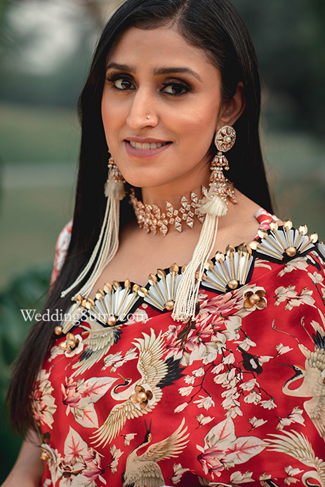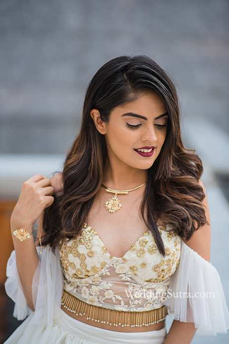 A flirty white lehenga by Label D was one that matched bridesmaid Simran’s bubbly personality perfectly. The monotone tiered skirt was paired with a ruffled cold shoulder blouse and the golden work on the top was matched with a tasselled trim. With bold lips and a few contemporary pieces of jewellery, she completed this youthful look.