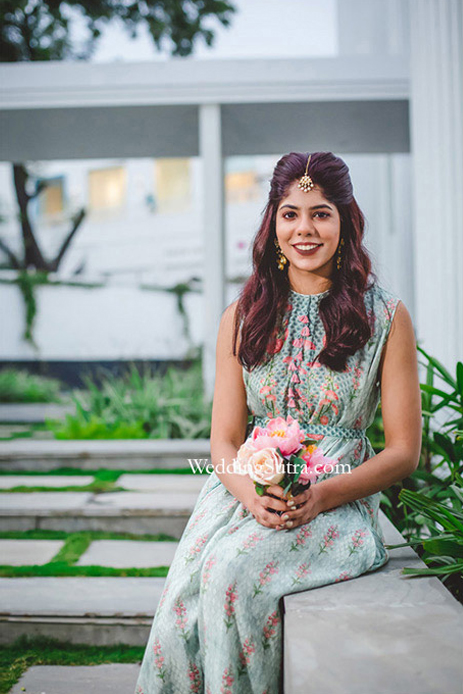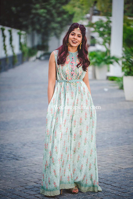 Mahek was another bridesmaid who proved that contrasting themes can be just as compatible by wearing an ethnic jumpsuit by Anita Dongre. Comfort and class came together in this outfit that made use of pretty pink tasselled accents that were used along with the buttons and the colour heightened the beauty of the floral motifs on the fabric. To add another layer of Indian aesthetic, the attire was paired with gorgeous polki jewellery.
