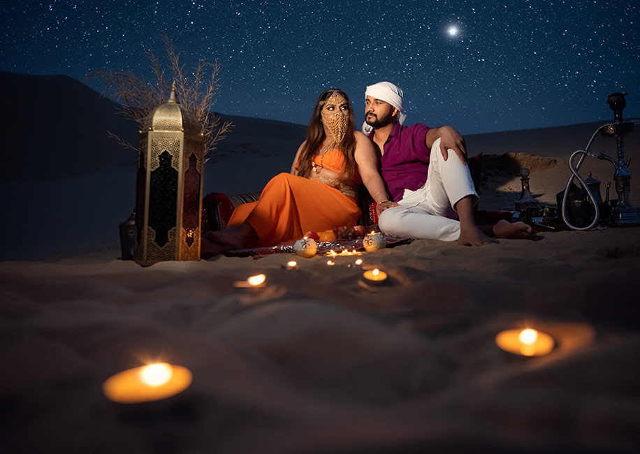 Qatar’s amber sunset desert and shimmering night sky framed this couple’s dreamy pre wedding shoot!