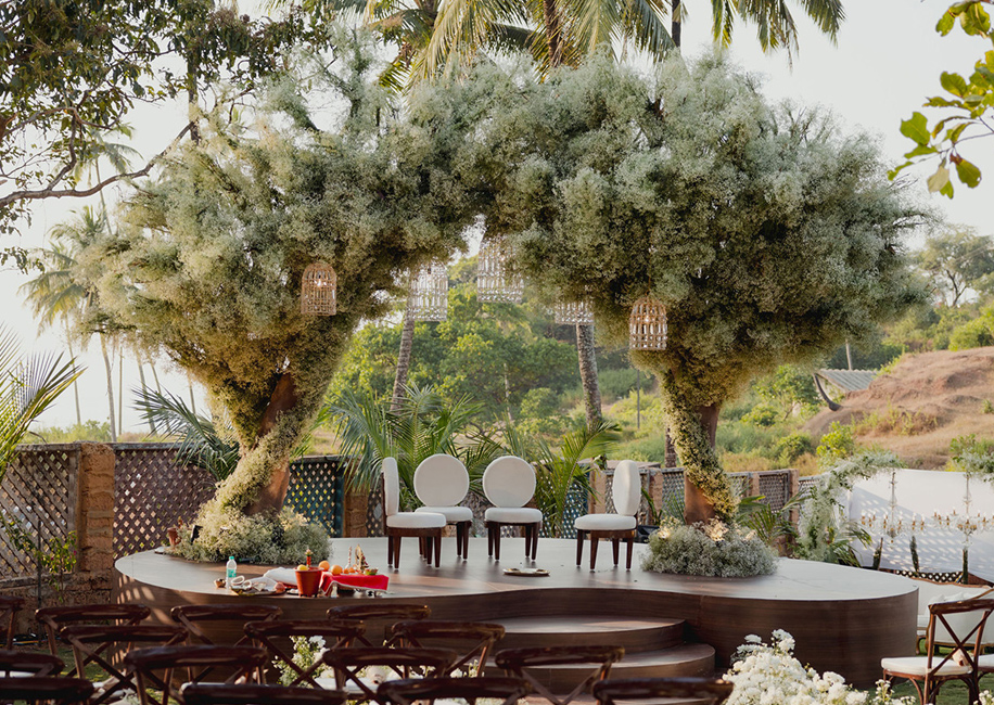 This couple’s unique nature-inspired wedding mandap featured two intertwining trees adorned with clouds of gypsos!