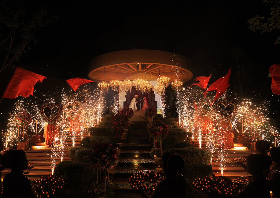 From the lavish red-draped canopies to crystal chandeliers and plush floral installations – this wedding decor was immersive and opulent!