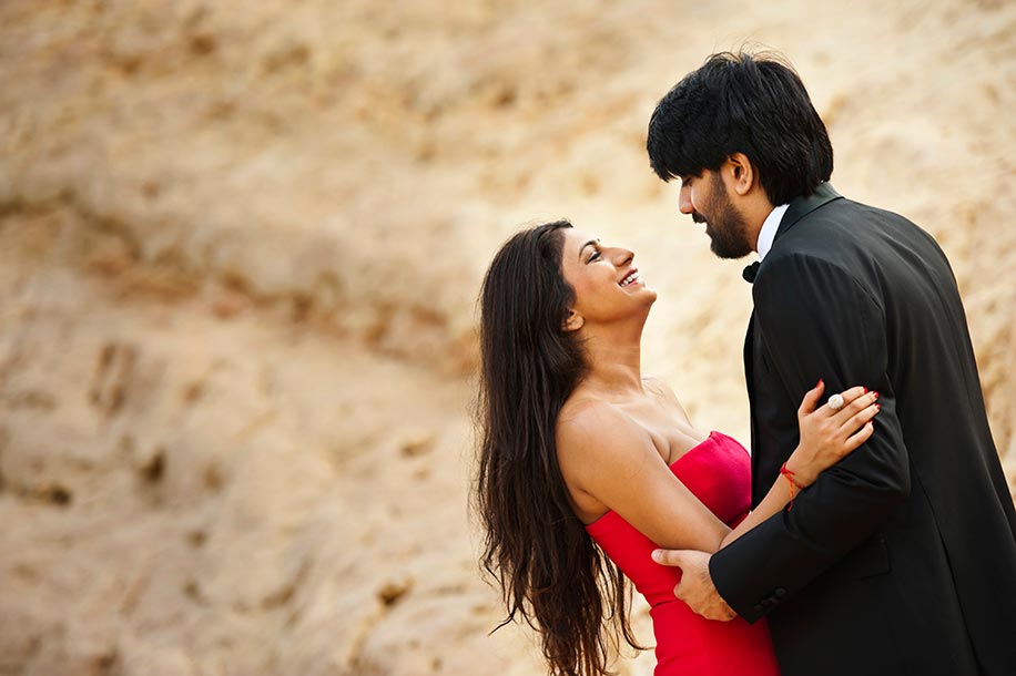 She looks regal in her red strapless gown against the brown backdrop of the sun-kissed Hajar mountains, while he appears...
