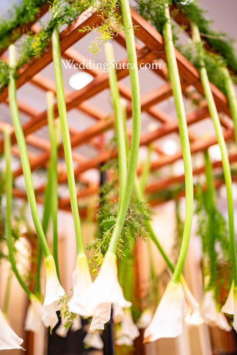 The first concept table had a sophisticated aura surrounding it as a printed black and white linen covered the table’s perimeter with carefully picked elements placed on top of it. The tea-light candles placed inside tinted glass holders, contemporary metallic lamps, classic white and silver cutlery added a hint of elegance to the table. The greens at the center of the arrangement and the fronds placed atop white napkins interlaced a refreshing vibe into the monochromatic color scheme of the table. The highlight, however, was the bunch of white calla lilies extended upside down above the table laced around a beautiful wooden framework.