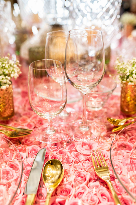 The second table had a strong floral influence as it was covered by a satin peach table cloth covered with pink roses placed under a glass casing. The crystal glasses, plates, and textured chalices along with the ornate chandelier at the center gave the table an elegant yet dreamy look creating a stark contrast between the two tables. The metallic chiavari chairs, bronze glasses holding gypsophila, golden cutlery and napkin rings added regal touches to the entire setup. Mehr’s remarkable creations were complemented with two cocktails curated especially keeping in mind the theme for the concept tables. The guests at the first table were served with Charcoal Sour and Bond Martini which stood true to the monochromatic theme of the tables created by Mehr. The other table enjoyed the tantalizing flavors of Cosmo, all three of which, were specially curated by The Wedding Bartenders and Hops Cork.