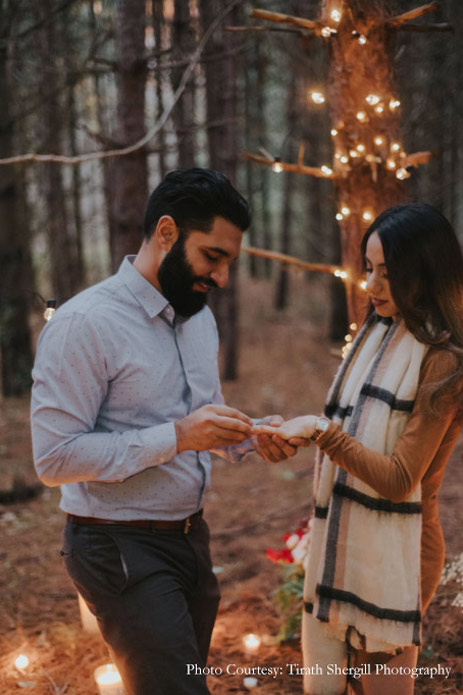 Babita says, “I love taking pictures and my best friend is a photographer so I thought this was just going to be a cozy fall/winter photo shoot. But, as we went into the forest, I noticed lights shimmering through the trees and heard soft music playing. When we got closer, I noticed the beautiful flowers, the candles and the fairy lights as Ushdeep went down on one knee and popped the question. Of course, it was a ‘Yes’!”