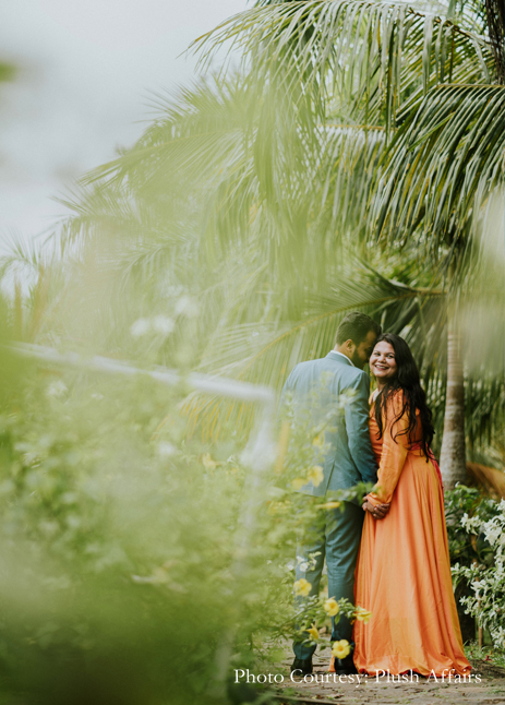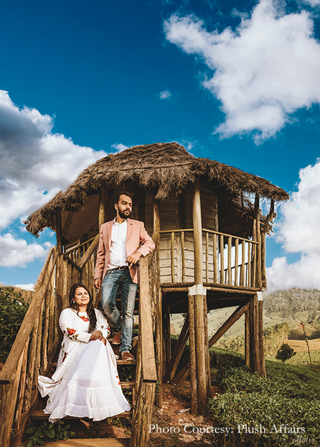 Isha and Sumit added a cinematic twist to their romantic pre-wedding photoshoot set in scenic Kerala. Plush Affairs manages to incorporate the characteristic traits that Kerala is known for – the lush landscapes, mountains and earthy indoor venues. The chemistry between the couple is tangible in the Bollywood-esque frames and their charming poses.