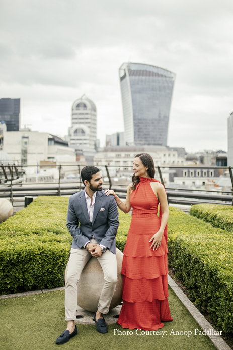 To maintain a distinct contrast with their wedding photographs which would all feature Indian outfits, the couple went with elegant Western ensembles. Danielle explained, “You can’t see from the shots, but there were lots of people around. It was a challenge to take good pictures with so many distractions, but Anoop deftly got great shots. Most of the shots were taken in the ‘City’ area of London, which is where we met and fell in love. It was special to revisit this area, anticipating our wedding, and have photographs to look back on forever.”