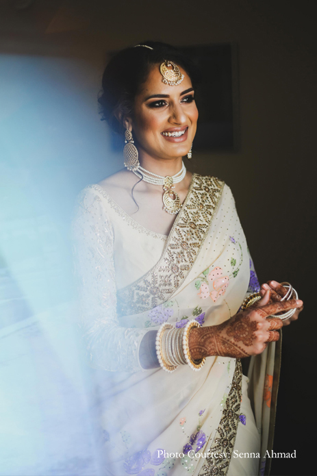 The celebrations began with the dhoki which was dominated by blue. The mayoun, which is essentially the haldi ceremony, of course, was all yellow. Our mehendi featured lots of pink. The wedding was dressed in white, gold, and lavender. Our engagement colors had been black and gold so we wanted to contrast that. We added the lavender because we got married in spring.