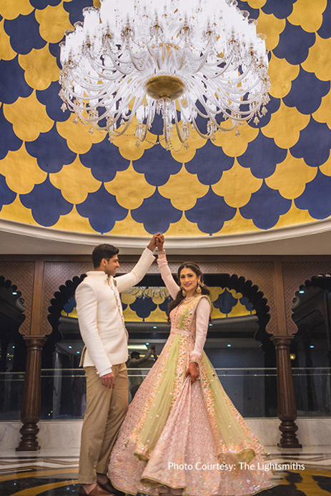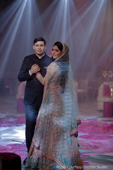 Marjhan looked queenly in a customized light blue and peach lehenga by Nomi Ansari with heavy embroidery for her lavish sangeet at the Four Seasons Resort Dubai at Jumeirah Beach.