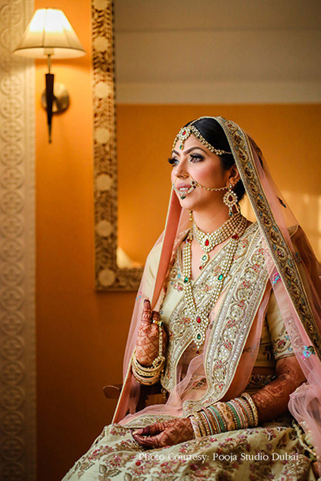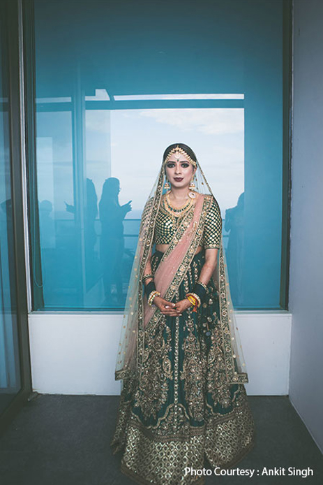 For the wedding, Swati chose a Sabyasachi inspired lehenga from Om Prakash Jawaharlal and paired it with a kundan and green beads choker to add a pop of color.