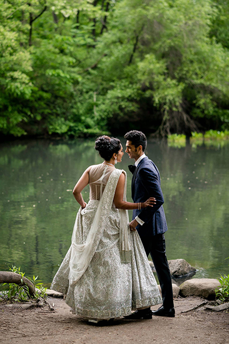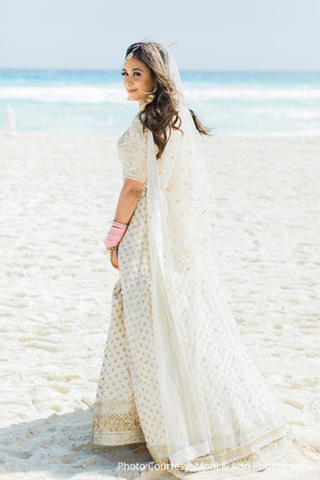 Komal was a Sabyasachi bride and wore an ivory lehenga from their Udaipur Collection to exchange vows on the beach in Mexico. The color was perfect for the sunny, outdoor ceremony.