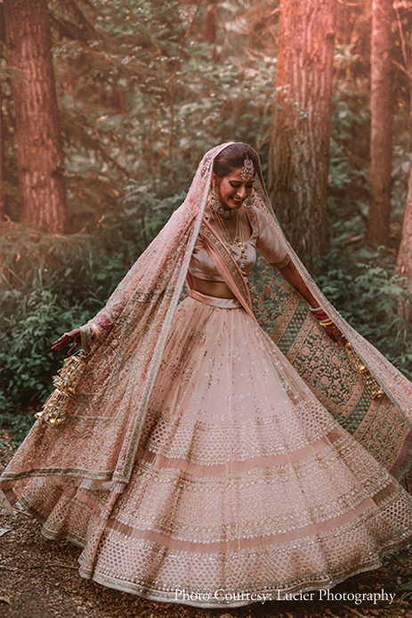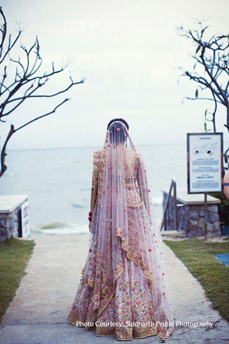 For her Indian fusion wedding in Portugal, Saloni wore a pale pink lehenga from Sara Design Studio by Rashi with beautiful thread work that exuded exotic elegance from top to toe.