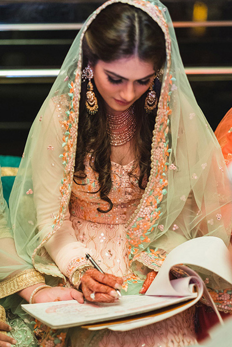 A Tamanna Punjabi Kapoor anarkali was the outfit of choice for Pamela for her nikaah function in Udaipur. The floor-length ensemble was created using pretty shades of peach and green and was paired with statement ornaments.