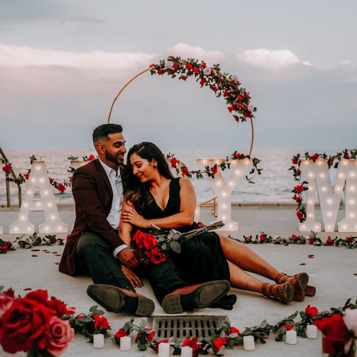 Adorned with scarlet roses and LED lights by the crashing waves, this wedding proposal exuded magical vibes