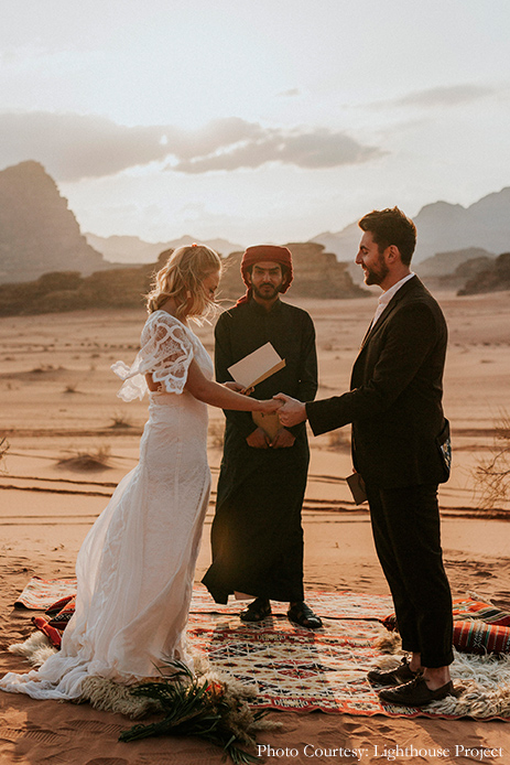 Charlotte and James from South England had already had a legal wedding but something was still missing. So one day, they packed their bags and ‘ran away’ to exotic Jordan’s otherworldly desert of Wadi Rum for a symbolic ceremony. “Jordan is an amazingly beautiful country with epic locations and breathtaking beauty. The country has always been on the top of our bucket list and we’ve always dreamt of ourselves in the desert,” says James.