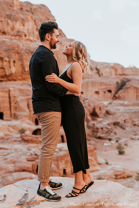 The couple met with their photographer from The Lighthouse Project a day prior to the vow renewal ceremony in the ancient city of Petra for a photo-shoot. “Petra was definitely the best location for what we had in mind for our Photoshoot. We enjoyed every minute of the planning and after a good search, we decided to go ahead with Teo and Anna from Lighthouse Photography. We immediately fell in love with their style and mood in their photos. We trusted them from the very first moment and discussed our vision and the locations that we had in mind via Skype” shares Charlotte. She goes on to elucidate on the concept and mood of their pictures and talks about her favorite photograph. “What we wanted for our pictures was a free-spirited, adventurous and non-posing style. The shoot was so easy going and we really enjoyed it. When we received our gallery we loved every picture in it but there is one that is our absolute favorite. It’s that where we are walking hand by hand in front of The Treasury or Al Khazneh. Stunning!” she says.