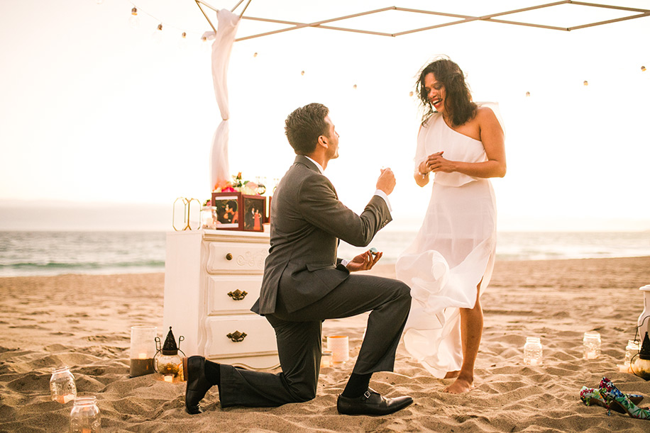 Adorned with scarlet roses and LED lights by the crashing waves, this wedding proposal exuded magical vibes