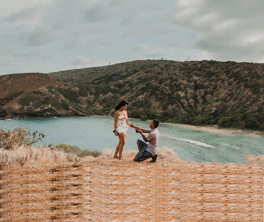 A Hawaiian wedding proposal set against the shimmering turquoise blue waters of Hanauma Bay!