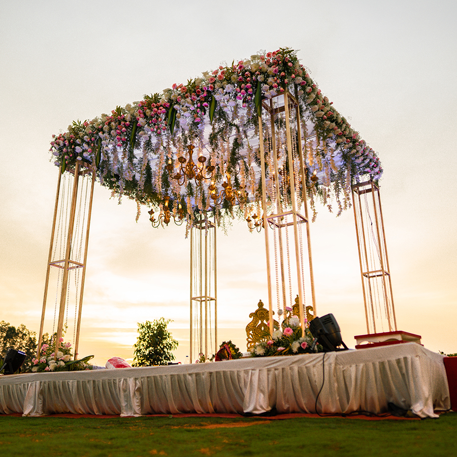 With a quaint mandap of orchids and chandeliers, this Bangalore wedding was framed against the setting sun