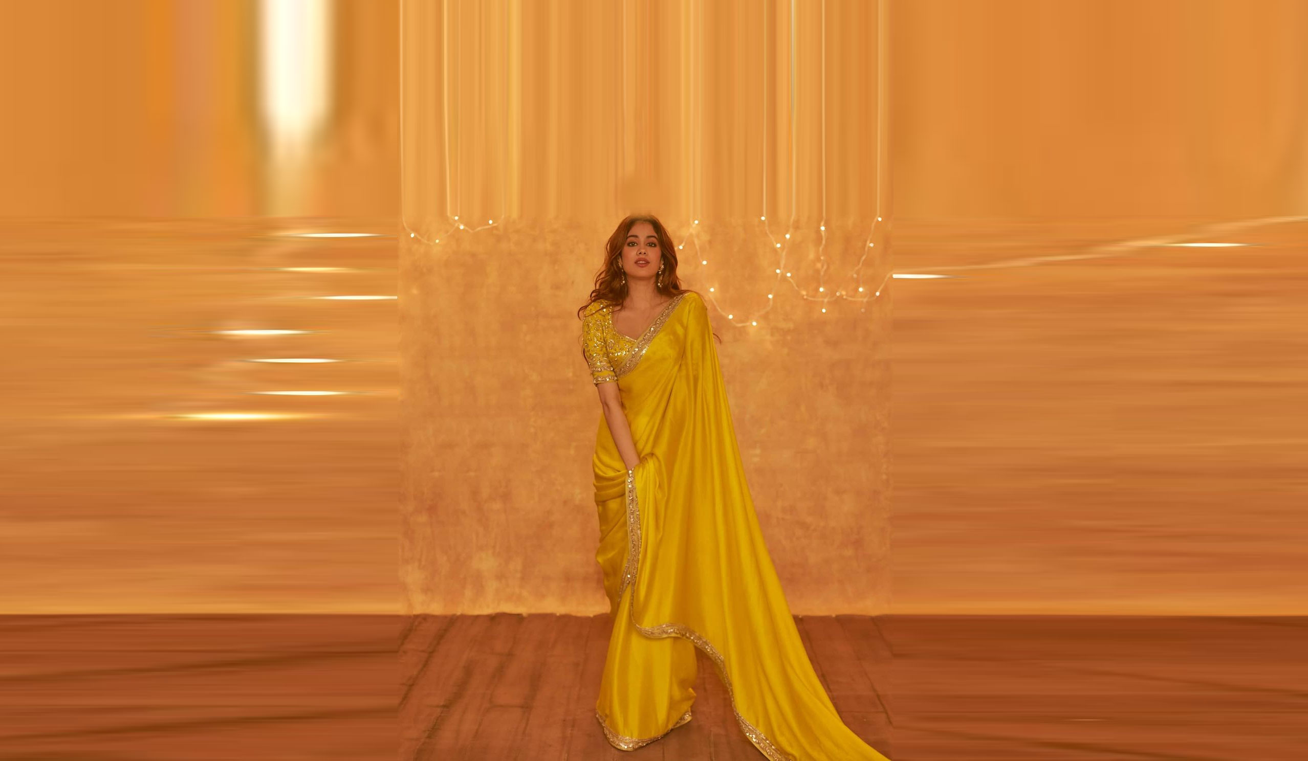 Actor Janhvi Kapoor in a yellow satin saree from Manish Malhotra's latest collection, ‘Ruhaaniyat’ is the Roka look we needed...