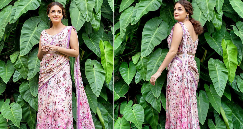 Wear a floral pre-draped saree for spring weddings just like Dia Mirza