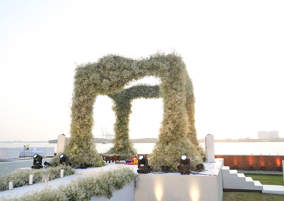 Bedecked with thousands of gypsos blooms, this waterside wedding mandap will take your breath away!