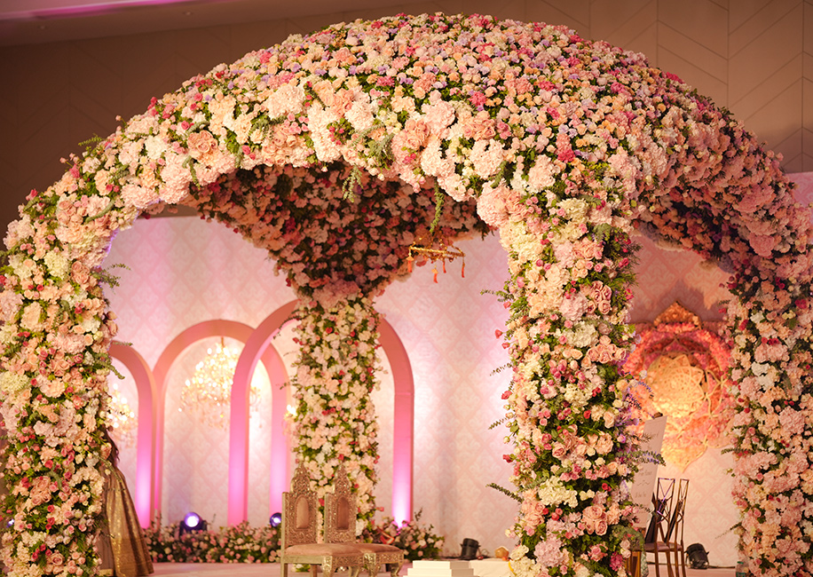 Tradition met glamour at this wedding with a Kerala-style welcome, a sleek sangeet, and an extravagant floral wedding mandap