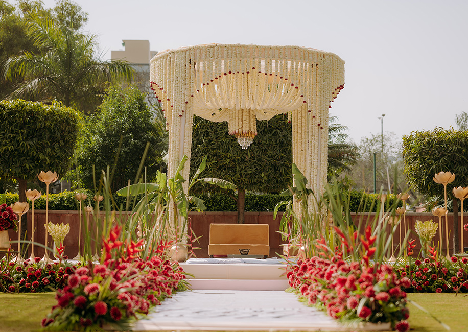 Minimalistic with a dash of vintage elegance, this couple’s floral all-red wedding mandap is bound to inspire!