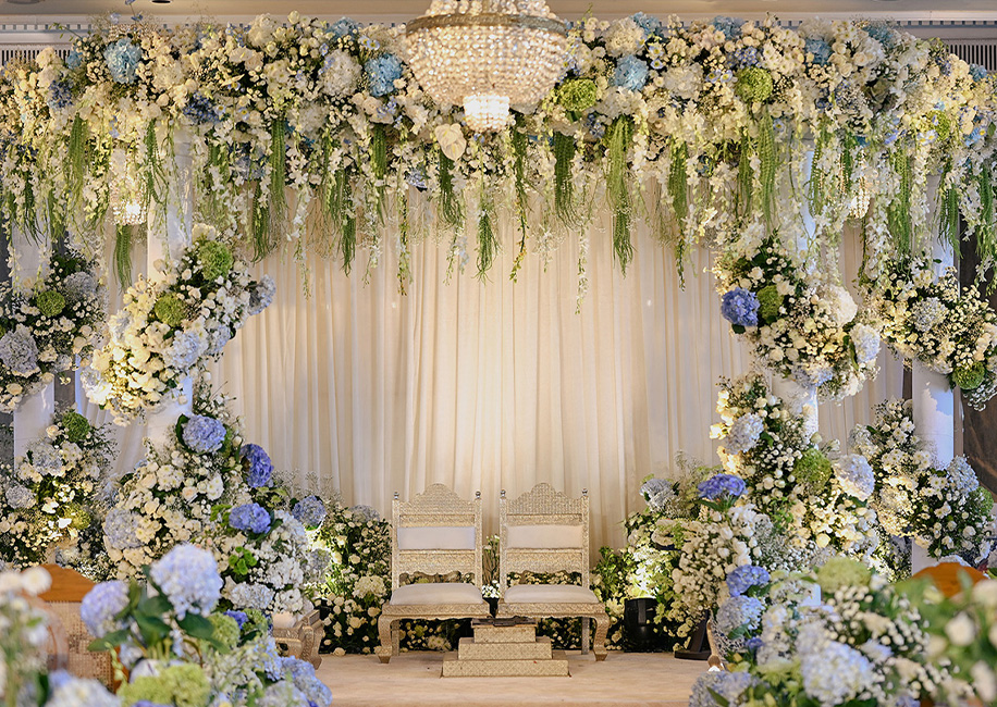 From vivid crimson hues to serene blues and whites, this couple’s wedding design story exuded elegance with a modern, glamorous twist