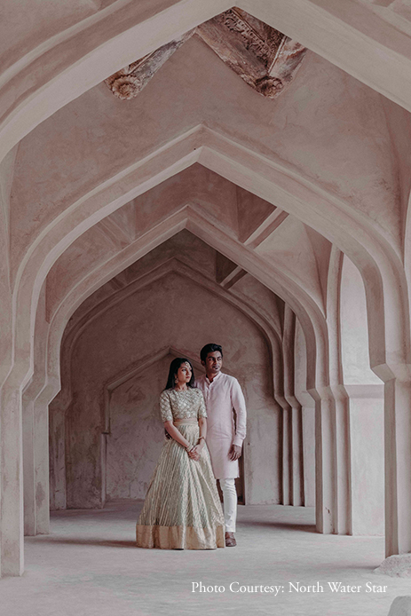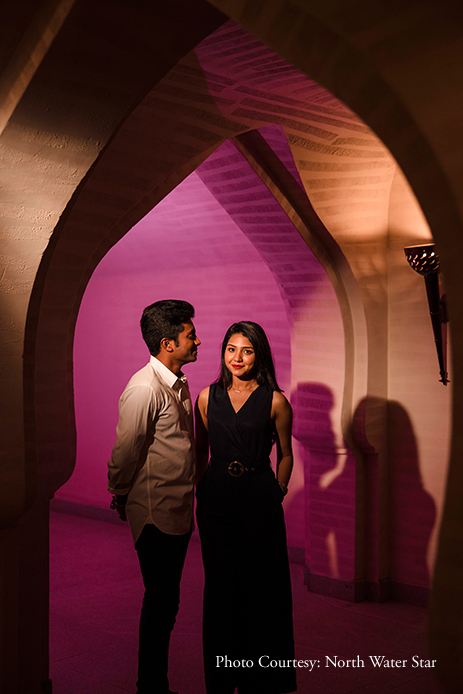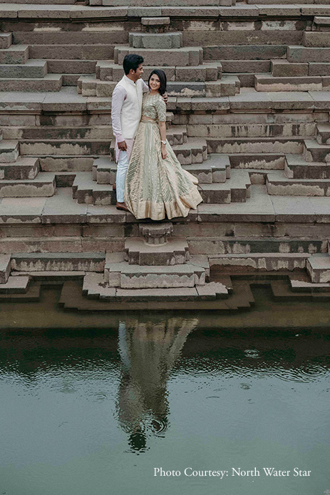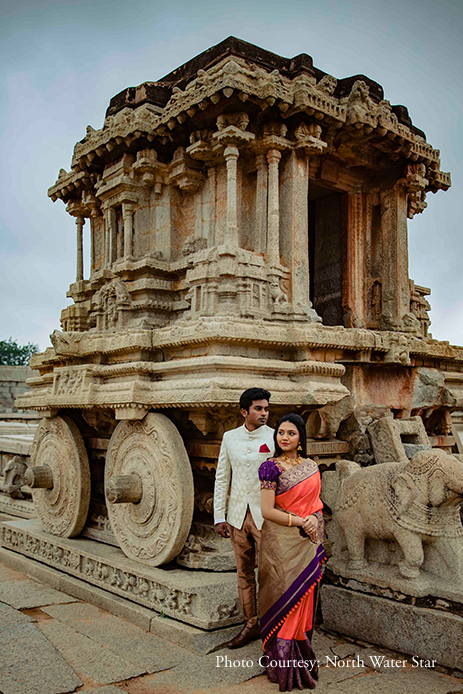 Rohini and Dheeraj, who met through an arranged marriage setup, recently got hitched at Dheeraj’s hotel, The Groves in Bangalore. Their pre-wedding shoot took place amidst the old stone ruins of the UNESCO World Heritage site of Hampi and at the stunning Evolve Back, Hampi resort that was built to mirror the majesty of the Vijayanagara kingdom. They chose WeddingSutra Favorite – North Water Star for the shoot whose team conceptualized the perfect frames to match the architectural splendor of the locations.