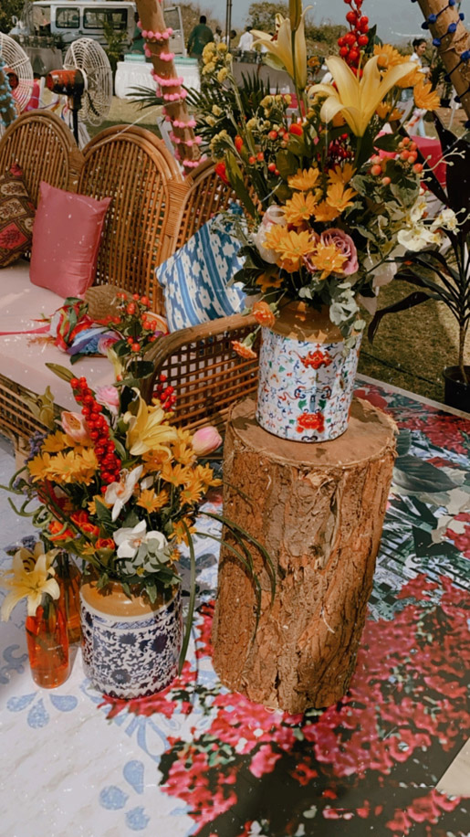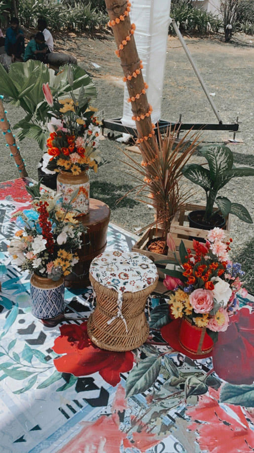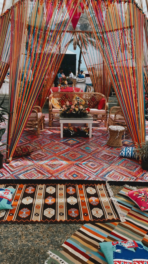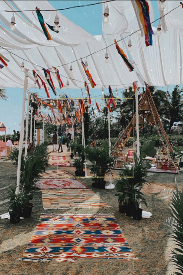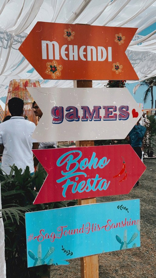 The mehndi was visualized as a ‘Boho Fiesta,’ and featured a mix of Mexican and bohemian elements that inspired guests to let their hair down and relax. Exclusive seating areas were furnished with cane armchairs, swings, and stools under a multicolored canopy. Adding a dash of Mexican culture were the potted cacti and taco stall that guests flocked to. Held at the Taj Fisherman’s Cove Resort & Spa, this event was a breezy affair in a beautiful setting.