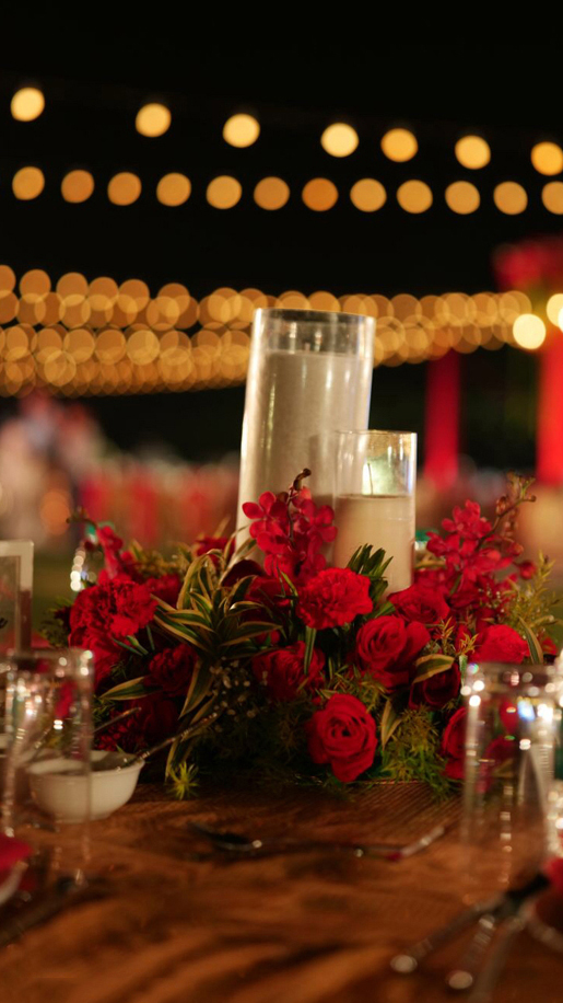 The post-wedding sit-down dinner was a step away from tradition, and involved subtle Western glamor with the theme ‘Romantic Reds’. With scarlet blooms dotting the tables on the lawn and the main canopy, almost everything had a touch of red. Glittering crystal chandeliers and a canopy of golden lights added life to the venue as the couple took to the stage for their first dance as man and wife. Adding an aura of romance to the night were the elegant candlelit tables that were decorated with roses.