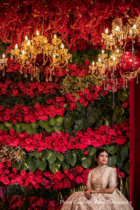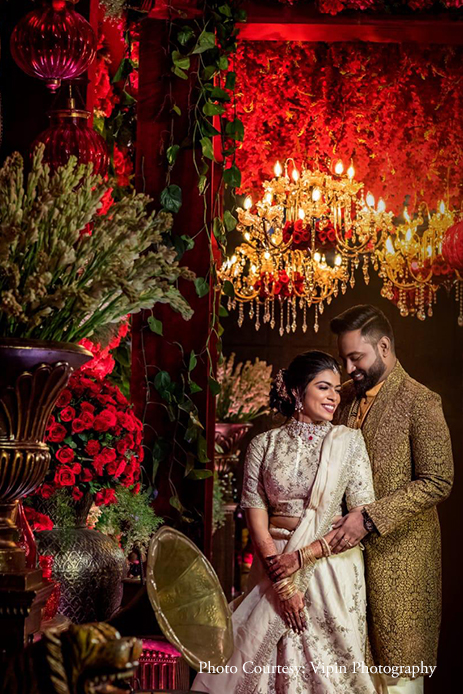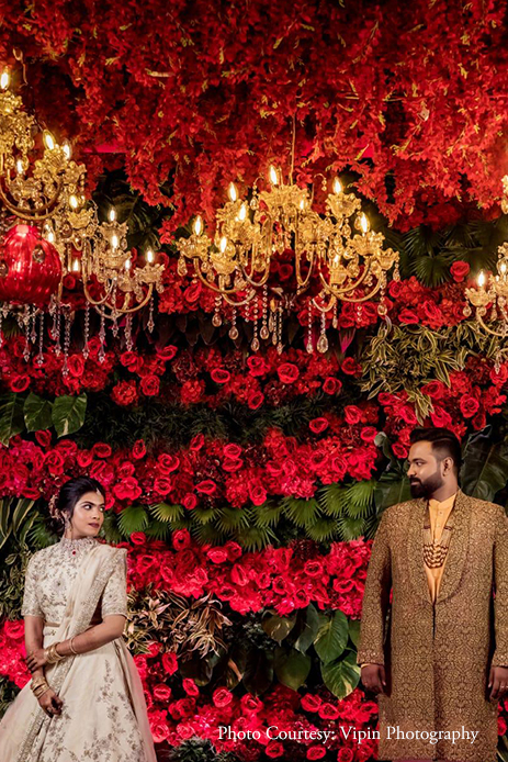 In stately hues of red, ivory and gold, the decor, executed by Epitome Events, exuded magnificence with extravagant floral arrangements, lush foliage elements and vintage bronze memorabilia such as vases and record players; all of it enveloped in the warm glow of ornate chandeliers.