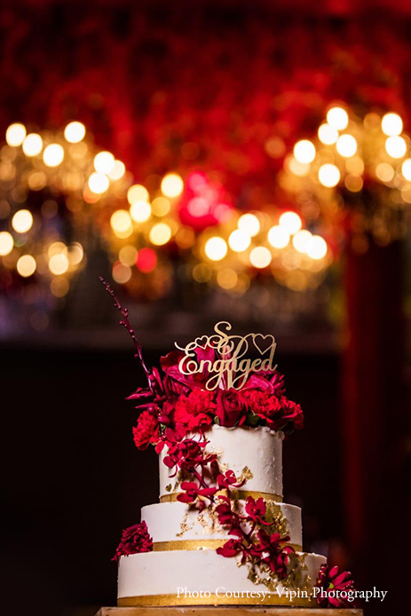 The couple each donned two outfits for the occasion. In keeping with the theme, the bride’s first ensemble was an ivory and gold classic Sabyasachi lehenga, which was teamed with diamond jewellery from Elite Diamonds, customized by her mother. The groom’s attire for the occasion was a bespoke Indo-Western outfit from Coax Couture.