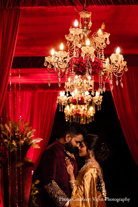 For the second look, the bride wore a silk saree from Kanchipuram in gold. She paired this with a custom-made blouse designed by Sruthi Kannath. The groom’s outfit, designed by Idris from Coax Couture, complemented her ensemble perfectly. The bride wore exquisite embroidered footwear from Abu Jani Sandeep Khosla X Needledust, while her glowing visage and elegant hairdo were created by the team of PRAK At Work. The glorious festivities were captured by Vipin Photography. The special moments of the day were filmed by WeddingSutra Favorite – Aaron Obed.