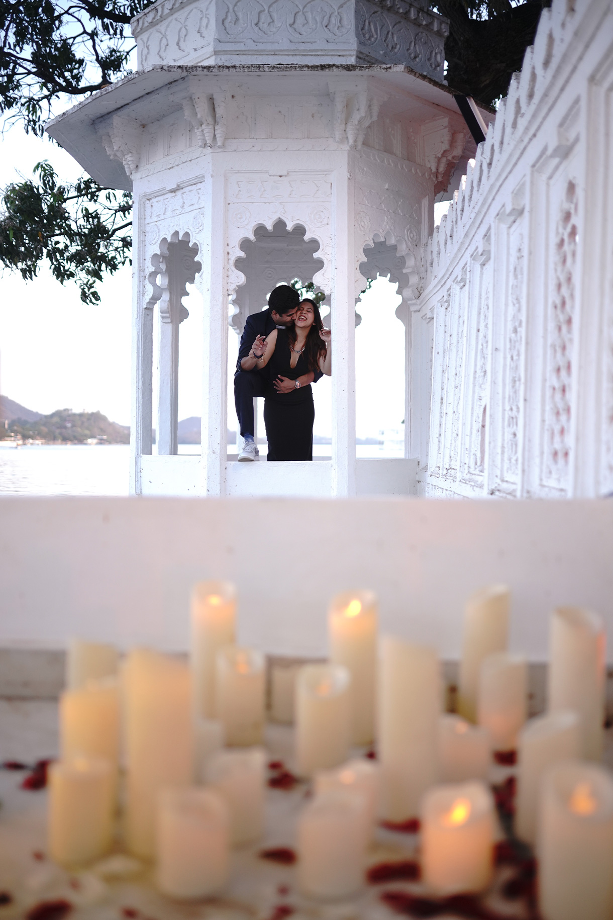 When the moment arrived, Akshay led his unsuspecting bride-to-be down a picturesque pathway. As they approached the lakefront, a grand ‘Marry Me’ installation stood waiting—framed by the shimmering waters, the palace in the distance, and their favourite songs drifting through the air. The atmosphere was nothing short of magical.”