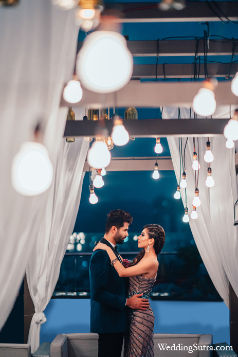 Charming colors find their place at the serene poolside of Vivanta Pune, Hinjawadi. A covered venue that opens up to a terrace welcomes abundant natural light that floods the spaces colossal windows. An ideal choice for daytime pre-wedding events such as a fun and lively mehndi, the venue offers the best of indoor and outdoor settings that come to life in shades of teal and fuschia. A gorgeous seat for the couple under an arch of branches festooned with purple and white blooms is placed perfectly on the deck by the pool and other quirky elements enhance the appeal of the aesthetics.
