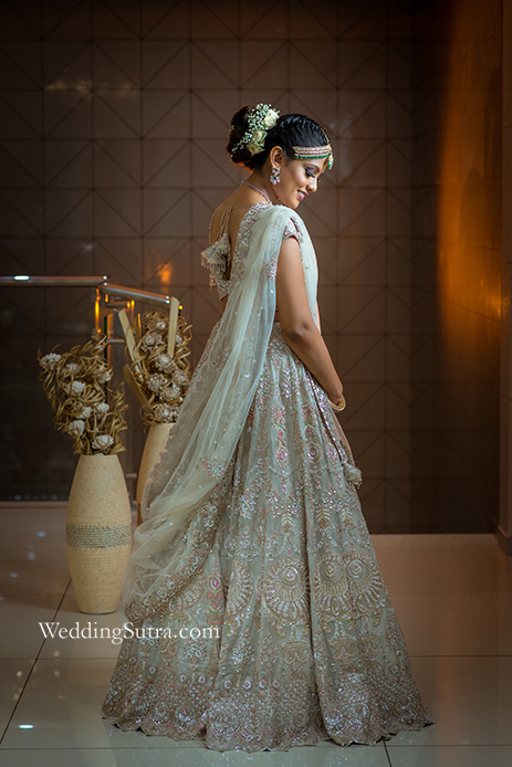 Talking about her face and hair, the bride says, “Hairstylist Bhagyashree twisted my hair into a simple yet classic bun which was embellished with white blooms. Makeup artist Sejal crafted a very modern and bold look on my face to balance the muted tones of the outfit. My bold lips and smokey eyes suited my face really well.”