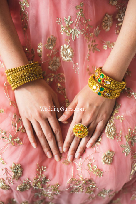 ‘Timeless and graceful’ was the aesthetic accorded to Richa’s mum. Each one of the baubles chosen for her was a classic with everlasting charm. A gold choker by Tanishq was the highlight of her ensemble. The necklace layered a row of emeralds upon a lattice of gold and kundan elements trimmed with pretty floral motifs. This was teamed with a pair of gold jhumkis featuring a row of pearls and a bold kada that made a statement.