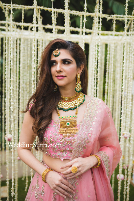 “Richa’s wedding is something that both of us have talked about for years and a part of me still can’t believe that all of this is really happening. Naturally, there are a lot of sentiments and emotions that we all are experiencing but it’s mostly happiness. As for my wishes, all I want is for her to have the happiest life ahead!” Traditional Indian aesthetics have their own charm and for Richa’s best friend, it was a classic aesthetic all the way. A tiered necklace by Tanishq made for an ideal choice. The rows of gold and kundan motifs placed in ascension trapped golden beads in their sockets, a charming detail. The necklace was fringed by large drop-shaped patterns that brought in some drama to the piece. The look was completed with golden jhumkis featuring intricate relief work and a kundan maang tikka trimmed with pearls. A maharani style kundan ring was also included in the ensemble.