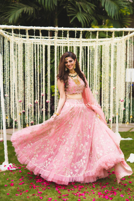 The candy pink lehenga by Anushree Reddy at AZA Fashion Bandra was selected keeping in mind the bride’s complexion and the cheery hues added to her bridal glow. The beauty of the monotone outfit was heightened by the silver floral detailing. The bride loved it, and said, “This lehenga was just gorgeous and was appreciated by everyone. The color made it perfect for a morning occasion and had I seen this before finalizing my trousseau, I would have picked this as the outfit for my big day.”