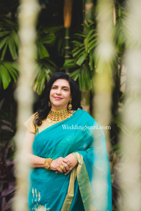 A versatile saree was best suited to the kind of classic and traditional look envisioned for the bride’s mother. A creation by RAR (Ritesh Aniket Rishav) at AZA Fashion Juhu was chosen for her and the drape in its rich hue was all that was needed to add life to this look.