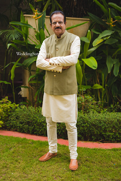 For the bride’s father, it was an SS HOMME – Sarah and Sandeep outfit that fit the bill. A crisp white kurta and chudidaar paired with an olive green bandhgala all hand cut and sewn to create a sharp, structured silhouette. The muted colors came together to create a look that was minimalistic yet extremely striking.