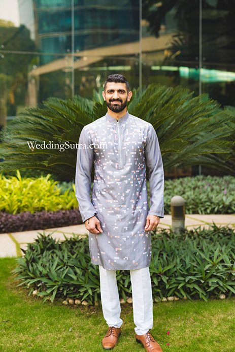 “As cliché as it sounds, it feels like it was yesterday when we were having some of the biggest fights over things so small that they don’t even matter anymore. Our relationship began as that of siblings, but over the years, she grew up to become my best friend and someone who was always around (quite literally!) whenever I needed her. With her gone, it’s not just the house that is going to feel a little more empty, it is also our lives which are going to feel just the same.” In order to give the brother a look that offered a subdued quirkiness of sorts, a grey kurta with geometric patterns from SS HOMME – Sarah and Sandeep was selected. The muted canvas of the clothes was punctuated by pastel accents that could be spotted in the designs evocative of the blocks from Tetris. The look was completed with a pair of white pants that kept to the sober color story of the attire.